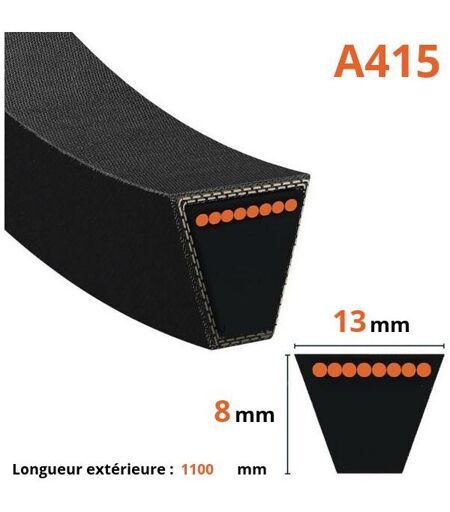 Courroie motobineuse Tromeca A41.5 Pour tromeca: TR560R, TR670RDE Nautac 51 AR Caractéristiques : Type : Trapézoidale lisse Largeur : 13mm Epaisseur : 8mm Description : Profil : A (13x8mm) Longueur extérieure : 1100mm Longueur intérieure : 1050mm Marque : MITSUBOSHI Un conseiller est à votre écoute pour tous renseignements. ...