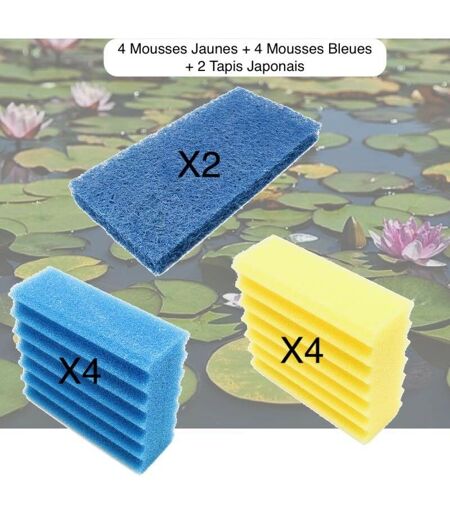 Le Poisson Qui Jardine - Lot De 4 Mousses De Filtration Jaunes + 4 Bleues + 2 Tapis Japonais, De Remplacement Pour Bassins - 4 Mousses Jaunes + 4