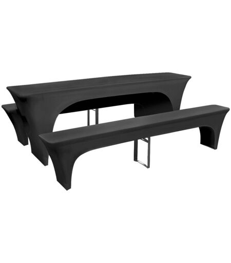Cet ensemble de housses taillées sur mesure sera idéal pour des réceptions, des mariages, des banquets et des fêtes de toute sorte. Il peut être utilisé pour un ensemble de table de pique-nique avec deux bancs, pour lui donner un aspect plus sophistiqué. Les housses protègent également votre table et vos bancs des rayures, des liquides et des taches. Faites en tissu extensible, les housses peuvent simplement être mises par-dessus les pieds de la table et des bancs. Le tissu est fait en fibre synthétique élastique à 10 %, les housses sont donc toujours à bonne taille. Les housses nécessitent peu d'entretien, sont réutilisables et lavables à 40°C. La livraison comprend 1 housse pour table de pique-nique et 2 housses pour bancs. Couleur: Anthracite Dimensions de la table adéquate : 220 x 50 x 80 cm (L x l x H) Dimensions du banc adéquat : 220 x 25 x 40 cm (L x l x H) Poids du tissu : 170 g/m² Exige peu d'entretien et ne se repasse pas Facile à laver à 40°C Réutilisable L'ensemble inclut 1 housse pour table de pique-nique et 2 housses pour bancs. Tissu : 90 % polyester, 10 % élasthanne Matériel: Polyester: 90%, Élasthanne: 10% ...