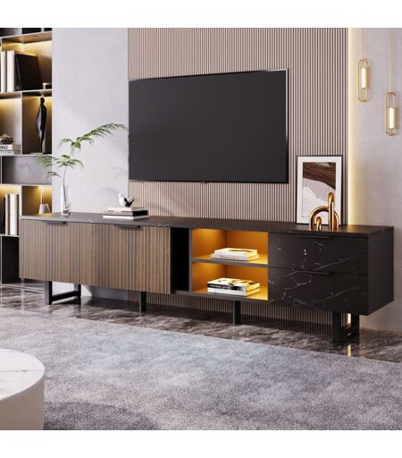 Fortuna Lai - Meuble tv led 200x50x38cm - avec 2 portes et 2 tiroirs - aspect marbre noir, portes grain de bois foncé - Noir
