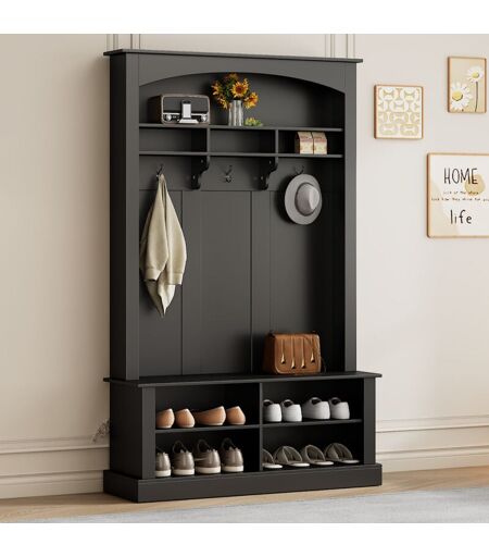 3 en 1 Ce porte-manteau est un beau mélange de rangement et de décoration, associé à un porte-manteau, un banc à chaussures et une étagère. Il offre suffisamment d'espace pour vos options de suspension quotidiennes. Le banc confortable est adapté pour changer vos chaussures, tandis que les 4 étagères inférieures supplémentaires peuvent être utilisées pour ranger vos chaussures, sacs et autres accessoires. Conception mince Avec ses lignes épurées et son design à plusieurs niveaux en bas, ce banc de couloir est un meuble moderne et minimaliste pour l'entrée. La forme arquée des panneaux à côté des crochets ajoute une touche d'élégance à l'ensemble. Tablettes réglables Le compartiment de rangement sous le banc dispose de 2 étagères réglables qui permettent un ajustement individuel aux différentes tailles et types de chaussures. En ajustant les étagères, vous pouvez utiliser de manière optimale l'espace dans le placard. Ceci est particulièrement utile lorsque l'espace est limité dans la ...