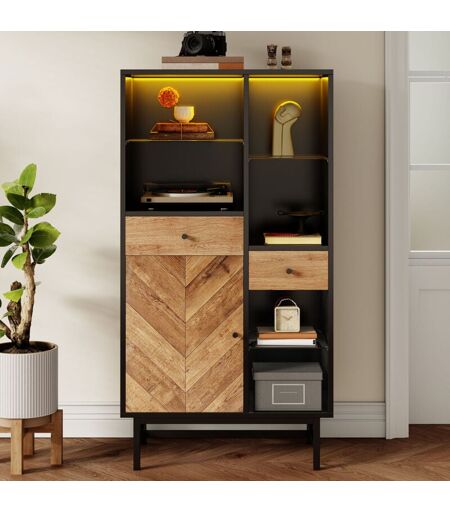Fortuna Lai - Vitrine led 150.5x80x40cm - meuble de cuisine avec tiroirs et étagères en verre - grain de bois triangulaire, noir + bois