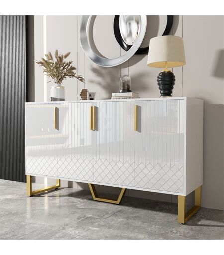 Fortuna Lai - Buffet 140x40x80cm - armoire avec 4 portes, pieds en métal, brillant, design géométrique blanc