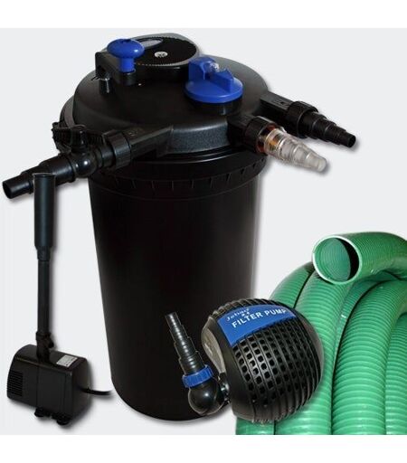 Le kit de filtration XXL comprend: Filtre à pression jusqu'à 30000l Stérilisateur / Clarificateur UVC avec 18W Pompe de bassin éco 8000l/h / 70W Tuyau résistant aux UV Ø25mm (1") - 25m Pompe de fontaine économique 800l/h / 15W ...
