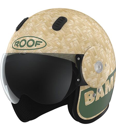 Casque jet. Coque 100% naturelle en fibre de bambou et fibre de lin. Utilisation des éco-matériaux pour sa confection et sa présentation : fibre de bambou, encre de chine, latex, carton éco-conçu, encres à eau. Habillage tissu en fibre de bambou. Mousse en latex naturel. Emballage éco-conçu : carton et encres à l’eau. Housse de transport en tissu naturel de bambou. Carénage de l'écran par plaques latérales en fibre de bambou pour assurer un maintien optimal de l'écran sur le casque et limiter les risques de rotations. Habillage SILENT LINING de confort aéré, ajustable et démontable. Homologation jet ECE 22.06 ...