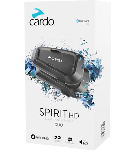 Intercom Bluetooth 5.2 CARDO SPIRIT HD DUO. Jusqu’à 2 utilisateurs. Connectivité TFT. Connectivité universelle. Appels, GPS, radio FM, musique. Radio FM : fréquences de fonctionnement de 76 à 108 MHz. RDS - Radio Data systems. 6 stations préréglées en mémoire. Portée : 600m. Dimensions (h x L x P, en mm) : 47 x 78 x 19. Poids : 35 g. Haut-parleurs HD. Dimensions haut-parleurs (diamètre x P) : 40mm x 10mm. Mise à niveau automatique du volume en fonction du bruit ambiant. Mise à jour sans câble. Charge rapide : 2h d'autonomie en conversation après 20 minutes de charge. Chargeur USB-C inclus. Application mobile Cardo Connect. Autonomie : 13 heures en conversation. Autonomie en veille : 10 jours. Temps de chargement : 2 heures. Température de fonctionnement : -20˚C à +55˚C. ...