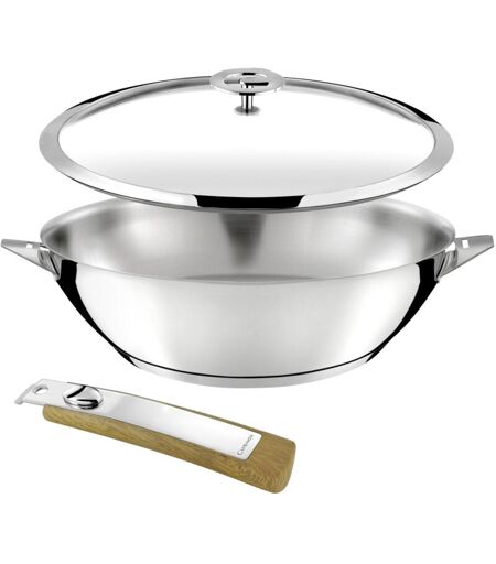 CUISINOX Eclipse - Set 1 wok 28cm inox avec couvercle, 1 poignée amovible effet bois