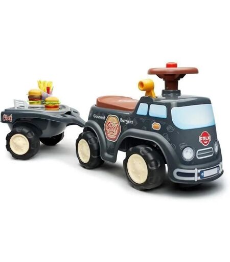 Une petite faim ? Il suffit d'appeler le porteur Food Truck Burger Gourmet Falk ! Incontournable des jardins en été, le barbecue embarque à bord du porteur pour enfant Food Truck de la marque Falk ! Doté d'un volant directionnel avec klaxon, ce Food Truck est très maniable. Votre enfant n'aura aucune difficulté à manoeuvrer à travers la maison et avertir de son arrivée tout en développant sa motricité globale. Ce porteur pour enfant Food Truck convient pour les petits chefs de 1 à 3 ans. Que désirez-vous ? Le menu du jour ? Votre enfant vous préparera ça en quelques minutes grâce à sa remorque barbecue et ses accessoires : deux burgers qu'il pourra assembler, un cornet de frits avec des sauces et une spatule pour la cuisson ! Votre petit chef burger pourra emporter facilement avec lui tous ses accessoires grâce au coffre de rangement dissimulé sous l'assise. Et pour se l'approprier totalement, la plaque d'immatriculation est personnalisable : il pourra écrire son prénom, ou donner un surnom à son bolide préféré ! Dimensions (L x l x H) : 90 x 30 x 35 cm Fabrication française Fondée en 1947, FALK est un des leaders du jouets roulant à pédales pour les enfants dès 1 an. Depuis 3 générations, tracteurs, pelleteuses, motos et quads en plastique sont imaginés, conçus et fabriqués à Oyonnax, au coeur de l'activité du secteur jouet. Les jouets Falk se démarquent par une conception et une fabrication 100% Made In France à l'épreuve des enfants les plus intrépides ! Garantie Le porteur enfant Glacier Falk bénéficie d'une garantie de 2 ans. ...