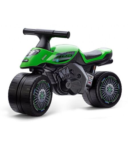 En selle pour une nouvelle course ! Le porteur moto Bud Racing de la marque Falk est parfait pour apprendre à marcher ! Ludique et pratique, ce porteur pour enfant accompagnera bébé dans ses premiers pas. En effet, il découvrira l'apprentissage de la marche et de la mobilité de façon autonome, et ce, tout en s'amusant ! Avec sa belle couleur verte, ce porteur moto pour bébé fabriqué en France est très stable, un jouet parfait pour développer la stabilité motrice de votre enfant. Un porteur confortable et stable Avec ses deux larges roues, ce porteur Falk est très stable et silencieux. Votre enfant pourra réaliser ses premières courses de cross en toute sécurité. Ce sera également l'occasion pour lui de développer son équilibre. Combiné avec un siège confortable et un guidon ergonomique, ce porteur moto assurera la première place à bébé ! Craquez pour cette belle réplique de la moto cross de grand prix de Brian Moreau de la team Bud Racing ! Caractéristiques du porteur baby moto Falk Avec son léger poids et sa petite taille, cette moto est facilement transportable pour l'emporter dans chacune de vos sorties. Bébé pourra l'utiliser aussi bien à l'intérieur qu'à l'extérieur, pour de petites ballades dès l'âge de 1 an, et ce, jusqu'à 3 ans environ. Son allure sportive et son incroyable réalisme feront briller les yeux des petits garçons, mais également des petites filles ! Dimensions du porteur pour enfants Falk Longueur : 62 cm Largeur : 25,5 cm Hauteur : 39 cm Poids : 2,3 kg Poids maximum supporté : 30 kg Un jouet farbqiué en France ! Ce porteur pour enfants Falk est fabriqué en France, dans la Plastic Vallée de l'Ain. Les techniques de fabrication sont basées sur l'injection et l'extrusion soufflage des matières plastiques. Garantie Le porteur baby moto Bud Racing Falk bénéficie d'une garantie de 2 ans. ...