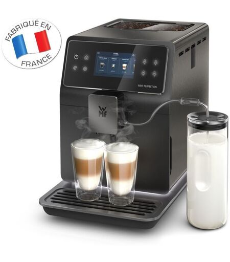 WMF, la marque de référence des machines à café depuis 1927, met à la disposition des amoureux du café son expérience de plus de 90 ans et son savoir-faire. Savourez le plaisir du café avec la machine à café à grains Perfection 860L de WMF. Au-delà du café parfait que vous aurez préparé selon vos goûts personnels, vous apprécierez cet expresso broyeur à café grains qui saura vous satisfaire... à la PERFECTION. LE PLAISIR DU CAFÉ, POUR TOUS VOS SENS Tous vos sens seront sensibles à la machine Perfection 890L de WMF. Le goût bien sûr, avec un choix de 18 boissons prédéfinies à base d'espresso, boissons lactées et thé, et une personnalisation selon votre goût avec une variété de paramètres et jusqu'à 16 profils personnalisables et facilement enregistrables. Vous pourrez également toucher cette perfection grâce à l'écran tactile très intuitif et innovant. Avec la technologie WMF DOUBLE THERMOBLOCS qui assure une extraction optimale, vous apprécierez les arômes magnifiées en dégustant un café de qualité inégalée. La mousse de lait que vous obtiendrez sera exceptionnelle, avec une consistance parfaite et des exigences de qualité professionnelle, même avec des variétés de lait végétal. VIVEZ LA PERFECTION Appréciez ce confort que vous pouvez tout d'abord voir avec son design ultra raffiné : son boîtier en acier inoxydable 18/10 de qualité supérieure Cromargan®, marque déposée et exclusive WMF est complété d'une finition noire avec effet brossé raffiné,d'un éclairage LED d'ambiance. L'élégant pot à lait en verre inclus dispose d'une contenance d'1 L. Vous serez également sensible au son particulièrement harmonieux de la machine dotée d'une structure double parois ainsi que d'une technologie d'amortissement supplémentaire au niveau de la pompe.Son utilisation est très pratique : le réservoir d'eau et le bac à marc de café sont facilement accessibles en façade, sans avoir à déplacer la machine.Enfin, le groupe d'infusion est autonettoyant et le nettoyage du système lait est 100% automatique, pour un nettoyage sans effort. De plus, les pièces amovibles sont compatibles avec le lave-vaisselle.Son utilisation est très pratique : le réservoir d'eau et le bac à marc de café sont facilement accessibles en façade, sans avoir à déplacer la machine.Enfin, le groupe d'infusion est autonettoyant et le nettoyage du système lait est 100% automatique, pour un nettoyage sans effort. De plus, les pièces amovibles sont compatibles avec le lave-vaisselle. LA QUALITE ET LA GARANTIE WMF Toutes les machines à café à grains de la gamme Perfection de WMF sont fabriquées en France avec toute notre expérience et notre savoir-faire. Elles bénéficient d'une réparabilité de 15 ans avec une mise à disposition rapide des pièces à coût limité pendant 15 ans et plus chez l'un des 6200 réparateurs agréés mondiaux. Enfin, elles bénéficient du label de certification " Hygiène "; délivré par TÜV Rheinland. ...