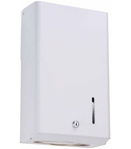 En acier poudré époxy blanc, pour 400 feuilles de papier enchevêtré 24 x 26 cm. Antivandalisme : fixation murale en 4 points. Ouverture frontale et blocage du capot en position ouverte : facilite le réapprovisionnement. Pièce plastique intégrée de régulation du débit assurant la distribution des essuie-mains en feuille à feuille. Verrouillage par serrure à clé. Repère de consommation. Coloris : blanc Dimensions (H x l x P) : 425 x 255 x 125 mm ...