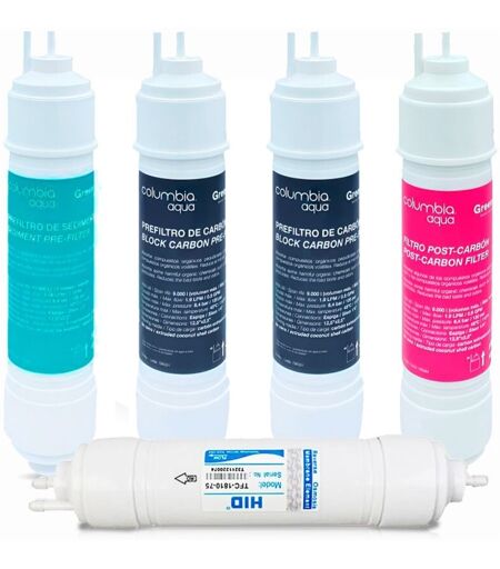 Kit de remplacement complet avec cartouches et membrane pour fontaine à eau à Osmose inverse RO Columbia pour modèles FC-530; FC-2210; FC-900; FC-750; FC-750S; FC-1300; FC-425; FC-525; FC-725. Green Filter. Filtres encapsulés, 2'5" de diamètre, avec raccord d'eau à robinet de type U 1/4" avec raccord d'entrée et de sortie par le haut. 1 filtre à turbidité de 5 microns, 2 filtre à charbon GAC de type bloc, Pos GAC et membrane RO encapsulée 75 GPD. Certificat de qualité NSF/ANSI 61 Kit de remplacement complet avec cartouches et membrane pour fontaine à eau à ultrafiltration Columbia UF pour modèles FC-630; FC-2210; FC-900; FC-750; FC-750S; FC-1300; FC-425; FC-525; FC-725; FC-4300 Filtres à eau pour fontaines à eau Columbia, encapsulés, 2'5" de diamètre, avec raccord d'eau à robinet de type U 1/4" avec raccord d'entrée et de sortie par le haut. Permet un entretien très rapide sans risque de fuites. 1 filtre à turbidité de 5 microns, 2 filtre à charbon GAC de type bloc, 1 POS GAC et ...