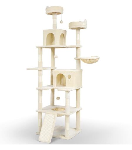 MULTIFONCTIONS : Notre arbre à chat permet à votre chat de dormir, de faire ses griffes, de s¿étirer et d¿observer son environnement librement; Avec 2 plateformes d¿observation et de saut, 2 jouets suspendus, 1 niche, 1 rampe de montée et plusieurs griffoirs, vos chats peuvent profiter de cet arbre à chat complet PARC D¿ATTRACTIONS : Cet arbre à chat a tout pour amuser votre chaton et l¿occuper dans ses phases actives; Il possède 2 jouets en forme de souris suspendus et amovibles et une petite balle sur le dessus; 5 griffoirs en sisal naturel sur la structure tels que rampe, jouets et les tubes afin que votre chat puisse faire ses griffes mais aussi des plateformes de saut et un structure facile à grimper ARBRE DE REPOS : L¿arbre est recouvert par une peluche confortable pour une sensation de douceur et de chaleur pour votre chat; Il possède une niche pour un repos en toute discrétion et une plateforme d¿observation surélevés STRUCTURE STABLE : La tour pour chat a une construction solide et a été étudiée pour une meilleure stabilité avec sa rampe d¿un côté; De plus les accessoires antichute vous permettent d¿accrocher votre arbre sur le mur ou autres INSTALLATION RAPIDE : Tous les accessoires sont fournis pour le montage, vous n¿aurez pas besoin d¿outils supplémentaires et une notice d¿instruction détaillée pour une installation facile et rapide ...