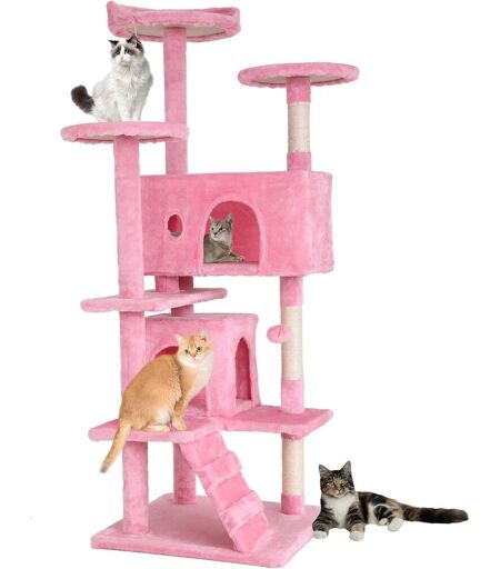 ¿[3 plateformes et 2 niche] Cet arbre à chat possède 3 plateformes avec des rebords rembourrés et une niche, il offre de la place pour observer et se reposer et convient aux familles ayant plusieurs chats. ¿[Repos et loisirs ] 2 grottes de tailles différentes, 2 boules à poils, 3 poteaux à griffer, 3 perchoirs élevés... Cette tour d¿avtivité satisfaire de divers besoins de vos chats, comme les repos et les loisirs.On dirait un centre de loisirs attirant. ¿[Facilité d¿escalade] La structure multi-niveaux et la plateforme latérale facilitent l¿escalade, même les chats âgés ou à mobilité réduite peuvent monter et observer leur environnement. ¿[Robuste et Confortable] Construite avec des panneaux de particules et recouverte de peluche doux, cette tour de chats est assez robuste et confortable pour offrir à vos petits compagnons une maison solide et agréable. ¿[Facile à nettoyer] Poils, saleté et résidus de litière¿ pas de panique : un rouleau anti-poils ou un aspirateur suffisent pour les éliminer facilement. ...
