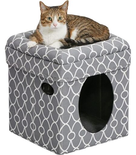 Curious Cat Cube, maison pour chat de 39,37 x 39,37 x 41,91 cm (L x l x H) une fois assembl¿¿, couleur champignon/imprim¿¿ en losange Construction solide et robuste, la niche pour chat est rapide ¿¿ assembler et se replie ¿¿ plat lorsqu'elle n'est pas utilis¿¿e, pour un rangement et un transport faciles. La cachette pour chat comprend une balle suspendue en peluche avec des ouvertures pour jouer ¿¿ cache-cache, une belle tani¿¿re intime pour cr¿¿er un refuge amusant pour le chat et un dessus rembourr¿¿ confortable pour permettre ¿¿ votre chat de se d¿¿tendre Curious Cat Cube, maison pour chat / refuge pour chat est une retraite id¿¿ale pour les chats et les petits chiens. L'entr¿¿e mesure 18,54 cm de large x 25,4 cm de haut. Une petite entreprise familiale qui f¿ºte ses 100 ans d'existence et qui emploie plus de 150 personnes aux ¿¿tats-Unis ...