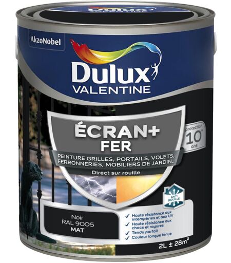 Dulux Valentine - ecran+ fer mat - Peinture pour fer intérieur/extérieur - Grilles, portails, volets, ferroneries, mobiliers de jardin - Noir Mat 2 l