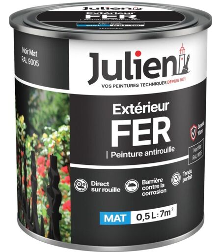 Julien - Peinture Fer Anti-Rouille Mat - Portes, grilles, portails, mobilier de jardin en métal - Noir Mat 0,5 l