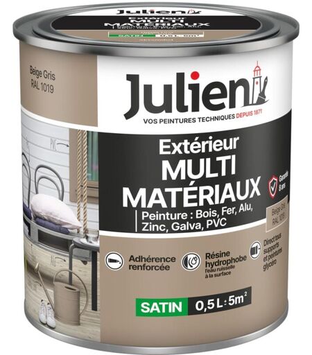 Julien - Peinture Multi-Matériaux Satin en phase Aqueuse - Bois, Fer, Alu, pvc, Zinc, Acier galvanisé, brut ou peint - Beige Gris 0,5 l