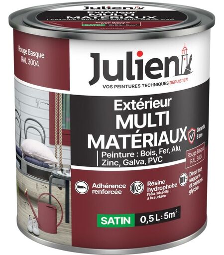 Julien - Peinture Multi-Matériaux Satin en phase Aqueuse - Bois, Fer, Alu, pvc, Zinc, Acier galvanisé, brut ou peint - Rouge Basque 0,5 l