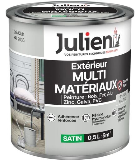 Julien - Peinture Multi-Matériaux Satin en phase Aqueuse - Bois, Fer, Alu, pvc, Zinc, Acier galvanisé, brut ou peint - Gris Clair 0,5 l