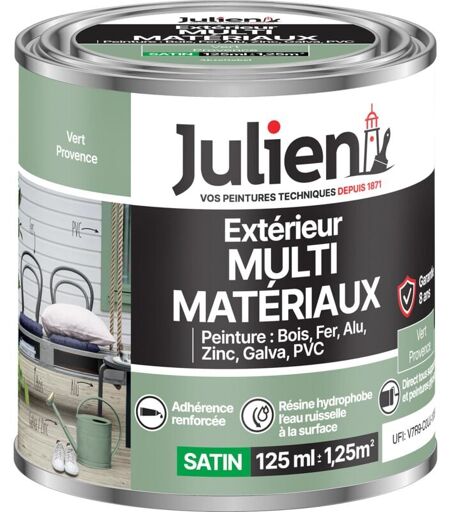 Julien - Peinture Multi-Matériaux Satin en phase Aqueuse - Bois, Fer, Alu, pvc, Zinc, Acier galvanisé, brut ou peint - Vert Provence 0,125 l