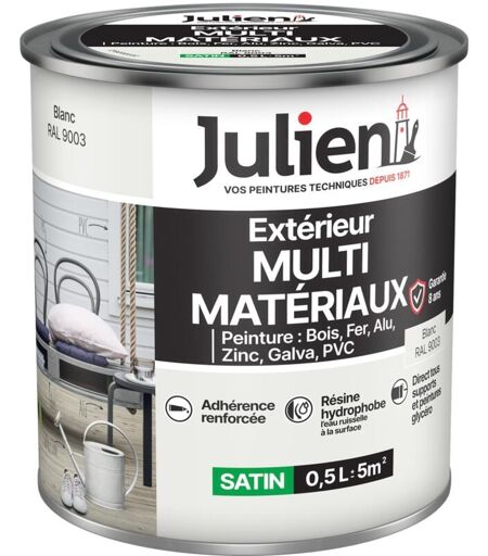 Julien - Peinture Multi-Matériaux Satin en phase Aqueuse - Bois, Fer, Alu, pvc, Zinc, Acier galvanisé, brut ou peint - Blanc 0,5 l