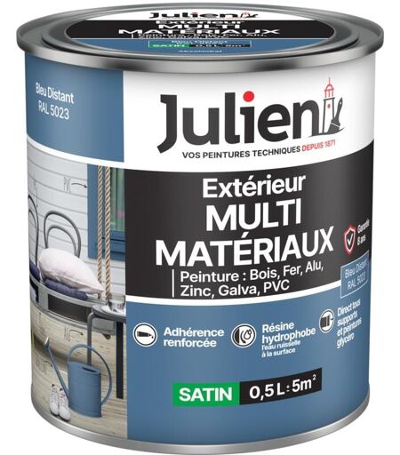 Julien - Peinture Multi-Matériaux Satin en phase Aqueuse - Bois, Fer, Alu, pvc, Zinc, Acier galvanisé, brut ou peint - Bleu Distant 0,5 l