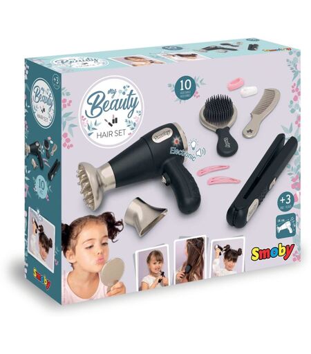 Set beauté composé d'un sèche-cheveux électronique (son et lumière) avec 2 embouts, d'un lisseur, d'une brosse, et d'un peigne. 2 élastiques et 2 barrettes sont incluses. A partir de 3 ans. ...