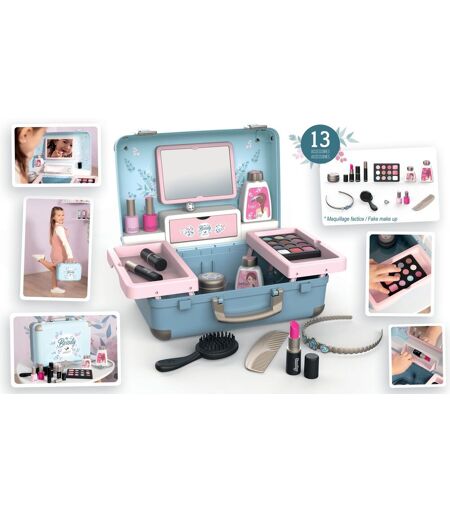 Découvrez un Vanity de Beauté compact et facile à transporter qui regroupe trois univers : la coiffure, la manucure et le maquillage ! Comprend 13 accessoires : 2 vernis, 2 rouges à lèvres, 1 palette de fards à paupières, 1 mascara, 1 brosse, 1 peigne, 1 serre-tête, 1 bague, et différents flacons (1 vrai miroir et 1 trappe secrète sont également inclus) Pratique : les tablettes sont escamotables pour un gain de place et des rangements supplémentaires ! ...