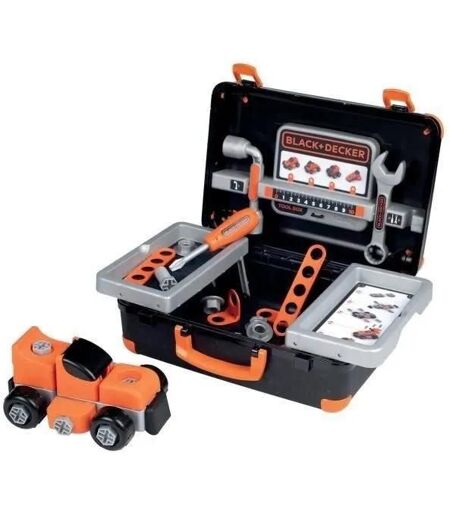 Mallette à outils Black + Decker Bricolo Box pour enfants La mallette à outils Black + Decker Bricolo Box est un choix idéal pour les enfants de 3 ans et plus qui aiment bricoler. Conçue pour être facilement transportable, elle est équipée d¿un support à outils, de tablettes de rangement, et d¿une poignée pratique. Contenu de la mallette La mallette comprend les éléments suivants : 3 outils : 1 tournevis, 1 clé à pipe, 1 clé plate 10 vis 5 écrous Des planches de construction Un véhicule à construire soi-même Apprentissage et divertissement Grâce à ce kit, les enfants peuvent s¿amuser à construire leur propre véhicule tout en découvrant les bases du bricolage. La mallette est à la fois facile à ranger et à transporter, ce qui en fait un excellent choix pour les petits amateurs de bricolage. ...