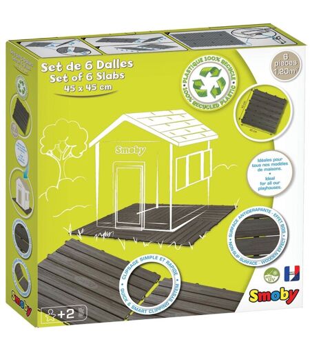 Ajoutez un fond à votre cabane pour enfant Smoby Vous pourrez enfin créer un plancher à la maison Smoby de votre enfant grâce à ce set ! Composé de 6 dalles mesurant 45 x 45 cm, ce set permettra à vos enfants de rester au propre lorsqu'ils jouent dans leur maison Smoby. Moderne, solide et antidérapant, ces dalles se fixent très facilement grâce à un système de clipsage intelligent et rapide. Antidérapantes et anti-UV, elles sont fabriquées en plastique 100% recyclé et 100% recyclable et possèdent un très bel effet texturé bois et sont traitées. Un set de 6 dalles convient pour couvrir une surface de 1,20 m². Certaines maisons Smoby nécessiteront plusieurs sets de 6 dalles. Vous pourrez également vous procurer plusieurs sets afin d'élargir l'espace de jeu en créant une terrasse, ou un chemin d'accès par exemple. Made In France Les produits Smoby sont intégralement pensés, conçus et fabriqués dans les usines Smoby en France. Installé dans le Jura, berceau du jouet français, le savoir-faire du personnel Smoby est incomparable et garantit un niveau de créativité, de qualité et de finition optimal pour un plaisir de jouer et un confort d'utilisation maximal. ...
