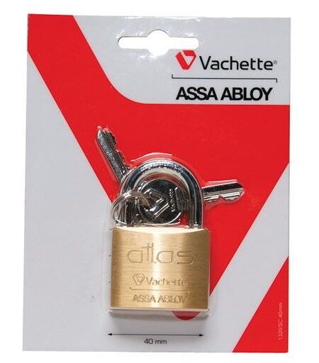 Cadenas Atlas à clé VACHETTE. - Corps en laiton massif de 40 mm verni satiné. - Anse sautante en acier nickelé. - Cylindre à goupilles. - Fournis avec 2 clés. ...
