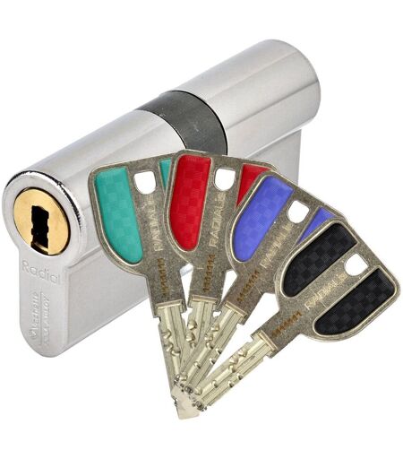 cylindre européen radialis Livré avec 4 clés brevetées réversibles couleurs et carte de propriété en 32,5 x 32,5 et en 32,5 x 42,5 mm. 3 clés sur les autres dimensions. Barre anti arrachement. Protection anti crochetage. Protection anti perçage. Goupilles multidirectionnelles en acier traité et embase acier. Finition nickelé. Compatibilité avec les versions précédentes de RADIAL. ...
