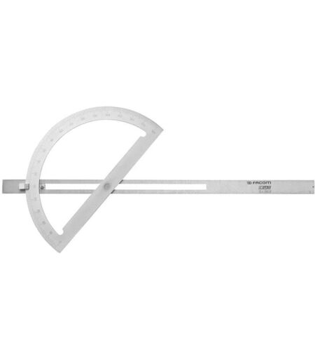 Rapporteur d'angle grande capacité Facom référence DELA.1880.00. Acier trempé. Graduations en degrés. Secteur évidé pour mesures d'angles de 10 à 170°. Ø du secteur : 200 mm. Longueur de la règle : 400 mm. Règle coulissante, blocage par vis. Décrouvrez le crayon de chantier Pica Dry 3030 et les sets de mines graphite / noir, rouge ou jaune ...