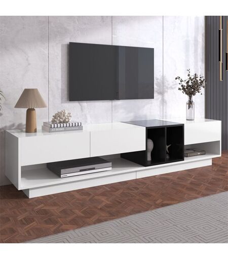 Fortuna Lai - Meuble tv 190x40x42cm, 3 tiroirs, 2 compartiments, Design bloquant les couleurs en blanc brillant et noir