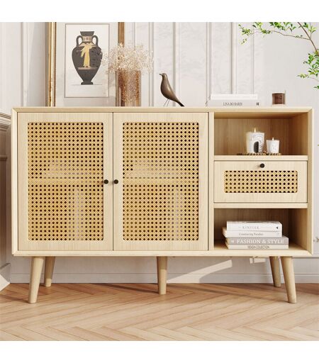 FORTUNA LAI Buffet en rotin 120x 40x80cm, avec 1 tiroir et 2 portes, pieds en bois massif, poignée en métal noir, étagères réglables, chêne