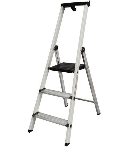 Escabeau en Aluminium 3 Marches CENTAURE pour tous type de travaux d'intérieur. - Montant peints en blanc non salissants pour les mains. - Marche barreaudée alu, sertie, de largeur 8 cm - Tableatte porte-outils avec de nombreux espaces de rangements - Plate-forme en acier strié et peinte en noir dimensions 25x26 cm - Articulation en acier protégé Epoxy, enveloppante, rivetée. - Garde corps de 60 cm - Patins rentrants dans le profil, antidérapants, vissés. - Conforme à la norme Européenne EN 131-2 Version 2012 et aux exigences de sécurité du décret 96-333. GARANTIE 3 ANS ...
