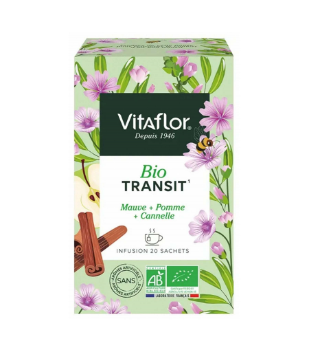 La tisane sachet Transit BIO de Vitaflor est une infusion bien-être conçue pour réguler en douceur votre transit intestinal. Composée de plantes et de fruits reconnus pour leurs bienfaits, tels que la mauve et la guimauve, cette tisane est idéale pour favoriser un bon transit. La mauve contribue à atténuer les inconforts digestifs, y compris les ballonnements, pour une sensation de légèreté. De plus, l'ajout d'un délicieux arôme naturel d'abricot apporte une touche gourmande à cette boisson tout en préservant sa certification Bio, garantie sans arômes artificiels ni conservateurs. Avec ses 18 sachets, la tisane Transit de Vitaflor offre une solution pratique pour prendre soin de votre bien-être au quotidien.Pour une infusion bienfaisante, la tisane sachet Transit BIO de Vitaflor réunit des ingrédients naturels de qualité. Les feuilles de mauve, les écorces de cannelle et les parties aériennes de rooibos s'associent à la pomme et aux racines de guimauve, tous issus de l'Agriculture Biologique. Cette composition unique offre une synergie d'éléments favorisant le bon transit intestinal. Avec sa certification Bio et sa fabrication française, cette tisane vous garantit une infusion naturelle et authentique, pour un moment de détente et de bien-être au naturel, à tout moment de la journée.En plus de ses bienfaits pour le transit intestinal, la tisane sachet Transit BIO de Vitaflor est une source de réconfort et de plaisir. Son délicieux goût sucré d’abricot laisse une agréable note fruitée en bouche, offrant une expérience sensorielle unique. De plus, cette tisane est naturellement sans gluten, pour une infusion adaptée à tous. Profitez de cette tisane certifiée Bio, alliant plaisir gustatif et bienfaits pour votre organisme, et laissez-vous tenter par un moment de douceur et de détente, à tout moment de la journée. ...