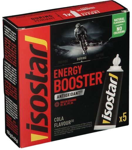 Complément alimentaire à utiliser dans le cadre d’une alimentation variée, équilibrée, d’un mode de vie sain.Le Gel Energy Booster Isostar se présente sous la forme d'un gel en dosette unitaire. Ce gel contient du cola ; il est aussi riche en glucides immédiatement utilisables par l'organisme et sera donc utilisé pour son action dynamisante.Il contient par ailleurs des vitamines B1, B2, PP et B6 qui contribuent à un métabolisme énergétique normal. Les vitamines B2, PP et B6 contribuent à réduire la fatigue.Composition:Sirop de glucose, Eau, Correcteurs d'acidité : acide citrique et citrates de potassium, Arômes, Chlorure de sodium,Extraits secs concentrés de graines de guarana (Paullinia Cupana K.) et de noix de kola (Cola nitida), Colorants : caramel de sulfite caustique et E150c, Vitamines B1, B2, B6 et PP, Maltodextrine.Fabriqué dans un atelier qui utilise : Lait, soja, gluten, poisson, noix, fruits à coques, crustacé, œuf, lupin, mollusque, céleri, moutarde, sésameValeur nutritionnelle: Teneur pour 100 gAJR* pour 100 gTeneur pour 20 gAJR* pour 20 gValeur énergétique1 360 kJ / 320 Kcal- 272 kJ / 64 Kcal-Lipides dont saturés0 g0 g--0 g0 g--Glucides dont sucres80 g51 g--16 g10 g--Protéines0 g -0 g- Sel0,24 g-0,05 g-Vitamine B10,63 mg57 %0,13 mg12 %Vitamine B21,0 mg71 %0,20 mg14 %Vitamine PP13 mg81 %2,6 mg16 %Vitamine B61,4 mg100 %0,28 mg20 %* AJR : Apports journaliers de référenceConseil d'utilisation:Pour un effet coup de fouet, juste avant le départ ou avant l'arrivée d'une épreuve et avant une côte ou une accélération. Il est conseillé de l'accompagner d'une boisson.Précautions d'emploi:À conserver dans un endroit frais et secPoids net:100 g Fabricant:Nutrition et SantéRoute de Castelnaudray31 250 RevelFrance ...