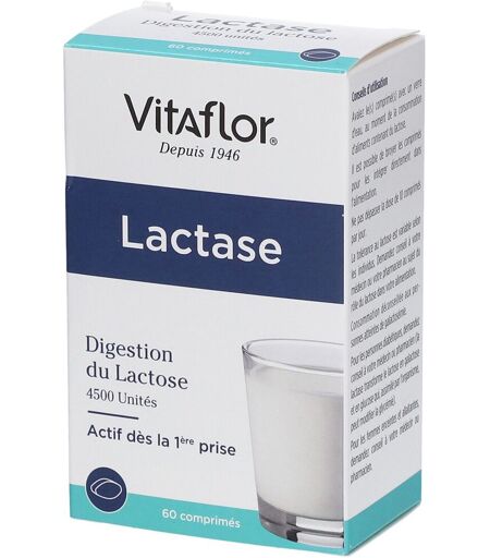 Complément alimentaire à utiliser dans le cadre d’une alimentation variée, équilibrée et d’un mode de vie sain. La lactase de Vitaflor est une enzyme digestive qui dégrade le lactose en glucose et galactose permettant ainsi aux personnes intolérantes au lactose de retrouver un confort digestif. L’enzyme lactase de Vitaflor est produite de façon naturelle par des champignons (Aspergillus Oryzae). A qui est destiné l’enzyme lactase de Vitaflor ? Pour les personnes intolérantes au lactose Pour les personnes ayant des troubles digestifs après avoir ingéré des produits laitiers Composition: Agent de charge : cellulose, poudre de lactase 706 mg (4500 unités FCC*), maltodextrine. Enrobage : supports (E463, E464), antiagglomérants (E553b, E470b). 2 comprimés = 4500 unités FCC* sont reconnus comme étant la dose minimale permettant la digestion d’un repas contenant une quantité de lactose moyenne. *FCC =Food Chemical Codex Valeur nutritionnelle: Pour 2 comprimés Poudre de lactase 706 mg (4500 unités FCC*) Conseil d'utilisation: Avalez-le(s) comprimés avec un verre d’eau, simultanément à la consommation d’aliments contenant du lactose. Il est possible de broyer les comprimés pour les (ingérer) intégrer directement dans l’alimentation. Ne pas dépasser la dose de 10 comprimés par jour. Précautions d'emploi: La tolérance au lactose est variable selon les individus. Demandez conseil à votre médecin ou votre pharmacien au sujet du rôle du lactose dans votre alimentation. Conserver à l’abri de l’humidité à une température ambiante, entre 15 et 25°C (enzyme thermosensible). Tenir hors de portée des enfants. Consommation déconseillée aux personnes atteintes de galactosémie. Pour les personnes diabétiques, demandez conseil à votre médecin ou pharmacien (la lactase transforme le lactose en galactose et en glucose qui, assimilé par l’organisme, peut modifier la glycémie). Pour les femmes enceintes et allaitantes, demandez conseil à votre médecin ou pharmacien Poids net: 46 g = 60 comprimés Fabricant: Laboratoires Diététique et Santé 3, rue des Quatre Cheminées 92100 Boulogne Billancourt France ...