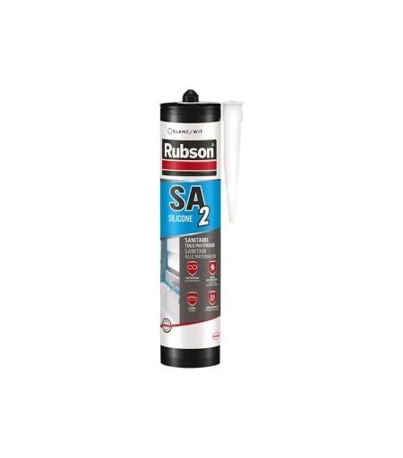 Rubson SA2 Sanitaire Blanc, Mastic silicone 2-en-1 pour émail et matériaux de synthèse, Joint sanitaire renforcé en antifongiques, finition lisse &