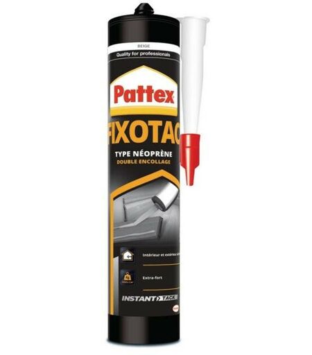 Colle mastic de fixation néoprène Fixotac de Pattex. Pour une application en intérieur et extérieur abrité. Tous matériaux sur tous supports même bloqué sur bloqué. ous les avantages d’une colle néoprène classique. Adhérence initiale élevée. Forte résistance à l’arrachement. Résiste à l’humidté (ex : utilisation en pièce humide). Applications : plinthes ou profilés (bois, caoutchouc, PVC rigide), lambris et tasseaux en bois massif ou non, profilés métalliques ou aluminium, liège. Supports : béton, enduit ciment, plâtre, plaque de plâtre cartonnée, parpaings, briques, carrelage, bois, stratifié, métal, verre. Ne convient pas pour le collage des miroirs, le polystyrène, le polyéthylène et le polypropylène. Conditionnement : Cartouche de 390 g. ...