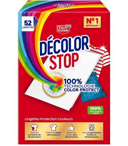 Décolor Stop protège votre linge contre les accidents de décoloration, ainsi que les dégorgements légers. Les couleurs qui dégorgent peuvent ternir les vêtements. La nouvelle gamme de lingettes Décolor Stop préserve l'éclat des couleurs lavage après lavage, grâce à la technologie 100% Color Protect. La preuve est sur la lingette !Fabriquées à partir de fibres 100% d'origine végétale, ces lingettes anti-décoloration permettent de réduire le nombre de machine et donc d'économiser du temps, ... ...