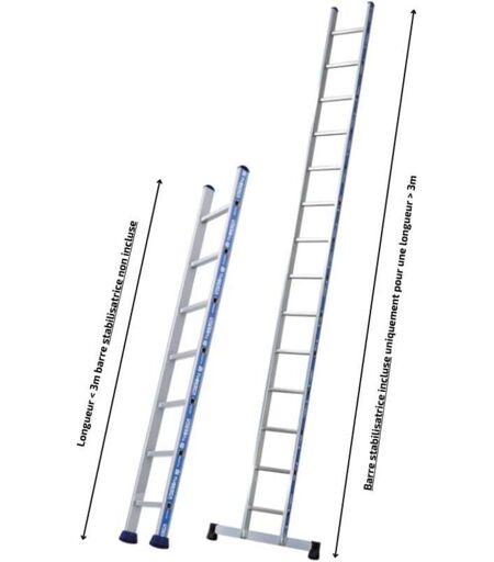Barre stabilisatrice obligatoire au dessus de 3 mètres Avantages Fabriquée en aluminium renforcé, l'échelle simple Platinium est dotée d'échelons de 30 x 30 mm offrant une durabilité accrue. Les modèles de plus de 3 m bénéficient d'une embase stabilisatrice avec sabots renforcés pour une stabilité maximale. Grâce à son design léger et ergonomique, elle est facile à transporter et à positionner. Conforme aux normes EN 131 et au décret 96-333, elle assure une charge maximale de 150 kg. Parfaite pour les travaux intensifs, elle garantit sécurité et performance sur tous vos chantiers. Sa polyvalence et son recyclage jusqu'à 92 % en font un choix durable pour les professionnels exigeants. Caractéristiques Fiable et résistante , facile à manipuler. Profils renforcés avec échelons 30 x 30 mm. Modèles >3,00 m : embase stabilisatrice avec sabots renforcés. Modèles ≤3,00 m : sabots crantés antidérapants. Charge maximale : 150 kg. Hauteur d'accès maximale : 7,82 m. Matière : aluminium recyclable ...