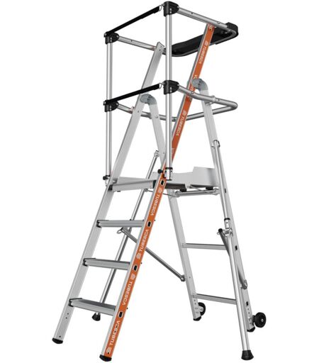 TRAVAUX EN HAUTEUR - Echelle à plateforme pour des travaux de second oeuvre, finitions, isolations ou plaquistes dans le milieu du BTP . - Plateforme individuelle roulante pour les peintres, plombiers ou menuisiers. - Poste de travail pour la maintenance ou la réparation de machines industrielles. - Rayonnage et picking dans des entrepôts logistiques. SECURITE - Escabeau avec un garde-corps avec sangles. - Plateforme antidérapante en bois 0.50 x 0.40m avec plinthes. - Grandes marches antidérapantes profondeur 80mm. - Nombre de marches plateforme comprise - Stabilisateurs latéraux qui évitent tout risques de basculement. DEPLACEMENT FACILITE - 2 roues non porteuses Ø 100mm. - Pemret de déplacer l'escabeau comme une brouette d'une zone de travail à l'autre. - PIRL ultra léger pour une manipulation et un transport sur chantier facilité. CONFORT - Equipé d'une tablette porte-outils résistance 25kg. - Crochet porte-seau 10kg. - Avoir le matériel et outils à disposition HAUTEUR DE TRAVAIL ...