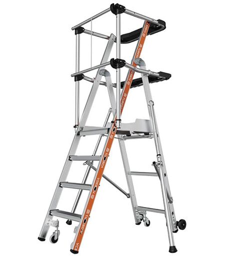 ACCES HAUTEUR SECURISE - Dans le milieu du BTP pour des travaux de second oeuvre, finitions, isolations ou plaquistes. - Escabeau PIRL idéal pour les peintres, plombiers ou menuisiers. - Echelle à plateforme our la maintenance ou la réparation de machines industrielles. - Poste de travail pour rayonnage et picking dans des entrepôts logistiques. SECURITE - Escabeau avec un garde-corps avec sangles. - Plateforme antidérapante en bois 0.50 x 0.40m avec plinthes. - Grandes marches antidérapantes profondeur 80mm. - Nombre de marches plateforme comprise - Stabilisateurs latéraux qui évitent tout risques de basculement. 4 ROUES ESCAMOTABLES - 4 roues pivotantes Ø 100 mm. - Dès la montée de l'opérateur la plateforme prend appui sur 4 patins. - Assure un travail en hauteur en toute sécurité - Ultra maniable, déplacement en position ouverte. DEPLACEMENT FACILITE - Equipé de 2 roues non porteuses. - Pemret de déplacer l'escabeau comme une brouette même sur terrain accidenté. CONFORT - Equipé ...