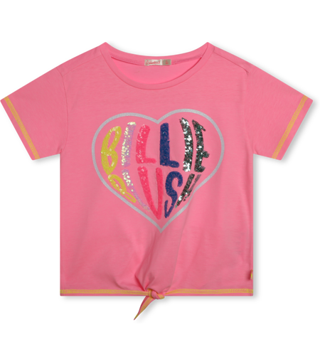 Ce T-shirt à manches courtes Billieblush est parfait pour composer une tenue décontractée moderne, confortable et très féminine. Le sigle Billieblush est enserré dans un coeur. Ce motif est orné de sequins multicolores. Ce modèle comporte un noeud à la base. BILLIEBLUSH, 462, Outlet, ETE 2024. ...