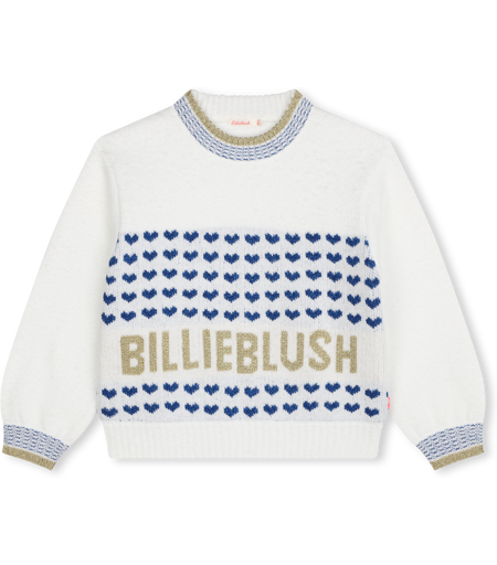 Ce joli pull Billieblush présente une encolure et des poignets brillants. Des lignes de petits coeurs façon marinière et un sigle ornent le devant. BILLIEBLUSH, RICE, Outlet, HIVER 2024. ...