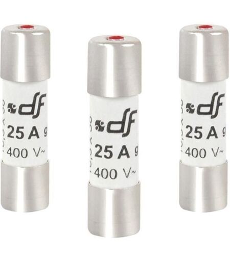 DEBFLEX Lot de 3 Fusibles 10.3x38 25 A - 3 fusibles céramique avec voyant 10,3x38 mm - Intensité : 25 A - Tension : 400 V - Les fusibles a voyant permettent d'identifier tout de suite le circuit en cause ou sur lequel s'est produite une anomalie - Une petite pastille rouge se ... ...