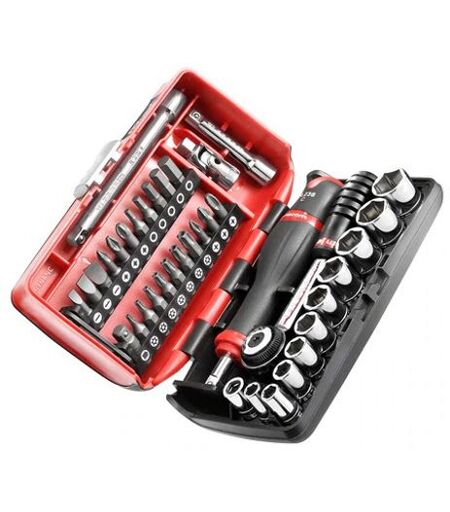 Avantages produit Coffret; de douilles et vissage 1/4'' FACOM R2NANOPB 38 pièces Ce coffret de douilles se compose de 38 embouts 1/4' pour le serrage et le vissage et fait partie des coffrets les plus compacts du marché. Son boîtier auto-fermant assure une sécurité optimale tandis que la numérotation bien; visible des douilles permet de les ranger au premier coup d'oeil. Résistant; et pratique, le coffret de douilles Facom a été conçu pour repérer; et sortir aisément les embouts. Equipés des dernières spécificités, les embouts de vissage Facom sont solides,; durables et performants. ; Inversion facilitée sans risque d?inversion accidentelle grâce au levier encastré même avec des mains grasses ou gantées Mécanisme ultra-résistant Étanche aux poussières industrielles Haute précision du cliquet RL.161 grâce aux 72 dents ainsi qu'une reprise d'angle à 5 degrés Double joint d'étanchéité Fatigue réduite par la légèreté du cliquet Centre de gravité déplacé vers la tête pour des mouvements de reprise plus aisés Coffret de rangement en plastique avec compartiments individuels Caractéristiques produit Coffret; de douilles et vissage 1/4'' FACOM R2NANOPB 38 pièces Modèle : coffret; vissage 1/4"' 6 pans Référence fournisseur : R2NANO; Contenu du coffret (38 pièces) : ; 1 x cliquet 1/4" "Paume de main" - R.161 10 x douilles 1/4" 6 pans métriques : R.5,5 - 6 - 7 - 8 - 9 - 10 - 11 - 12 - 13 - 14 mm 21 x embouts 1/4" série 1 - L 25 mm : ED.1T High Perf' pour vis cruciformes Pozidriv® : PZ1 - PZ2 - PZ3 EH.1 standard pour vis 6 pans creux métriques : 3,0 - 4,0 - 5,0 - 6,0 - 7,0 EP.1T High Perf' pour vis cruciformes Phillips® : PH1 - PH2 - PH3 ES.1T High Perf' pour vis à fente : F4,5 - F6,5 - F8,0 EXR.1 standard pour vis Resistorx® : TT 10 - TT 15 - TT 20 - TT 25 - TT 27 - TT 30 - TT 40 1 x embout porte-douilles 1/4" - ECR 1 x cardan universel 1/4" - R.240A 1 x douille 1/4" porte-embout à jonc de retenue standard - R.235 1 x poignée tournevis 1/4" courte - R.236C 1 x rallonge 1/4" standard L 55 mm - R.209. 1 x rallonge 1/4" standard L 100 mm - R.210 ...